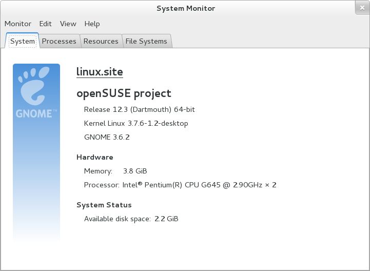 "GNOME System Monitor" can be launched from command launcher (Alt+F2) using command "gnome-system-monitor". The System monitor shows that openSUSE 12.3 / GNOME 3.6 will ship kernel version 3.7.x and GNOME version 3.6.2.